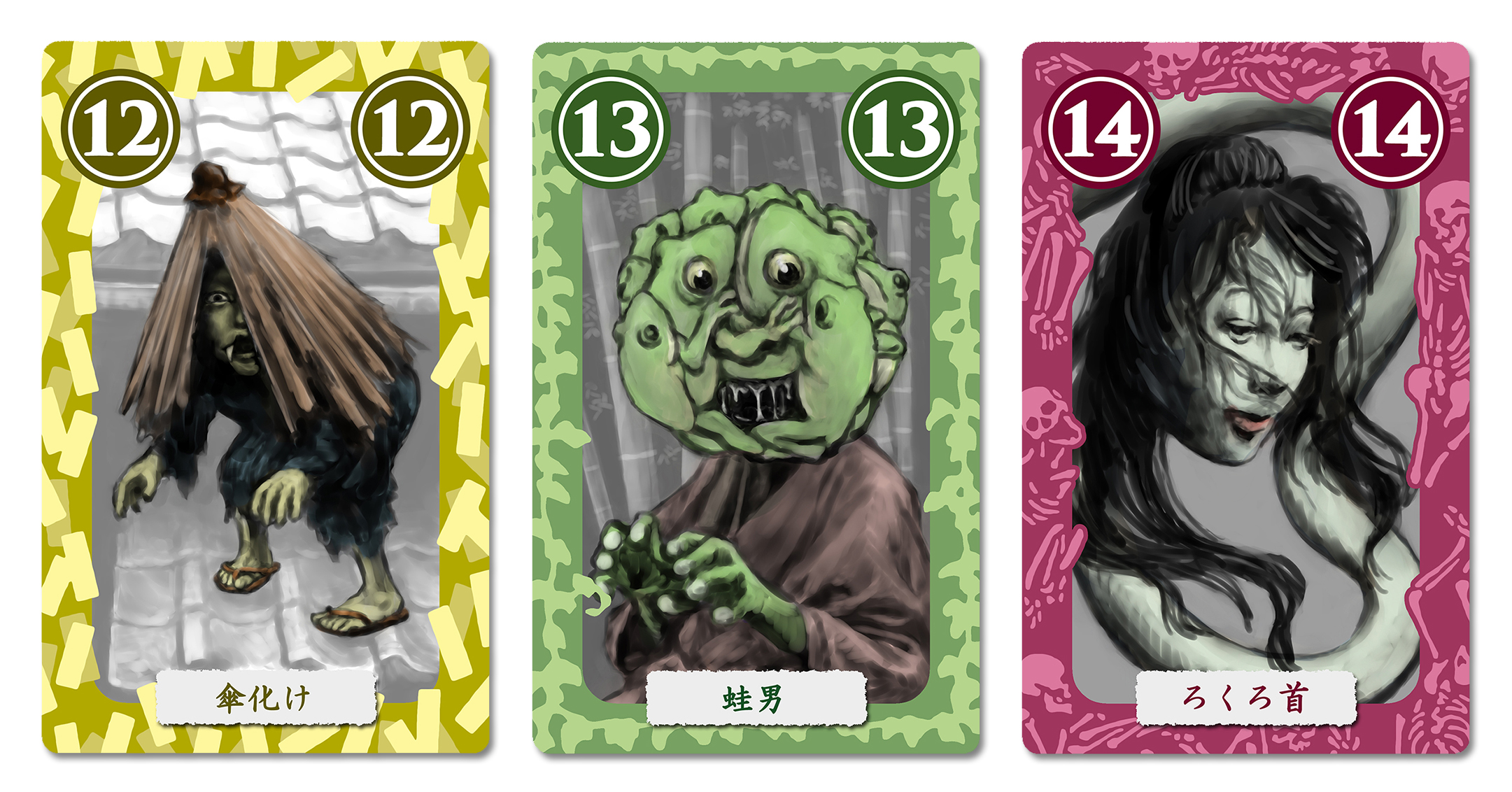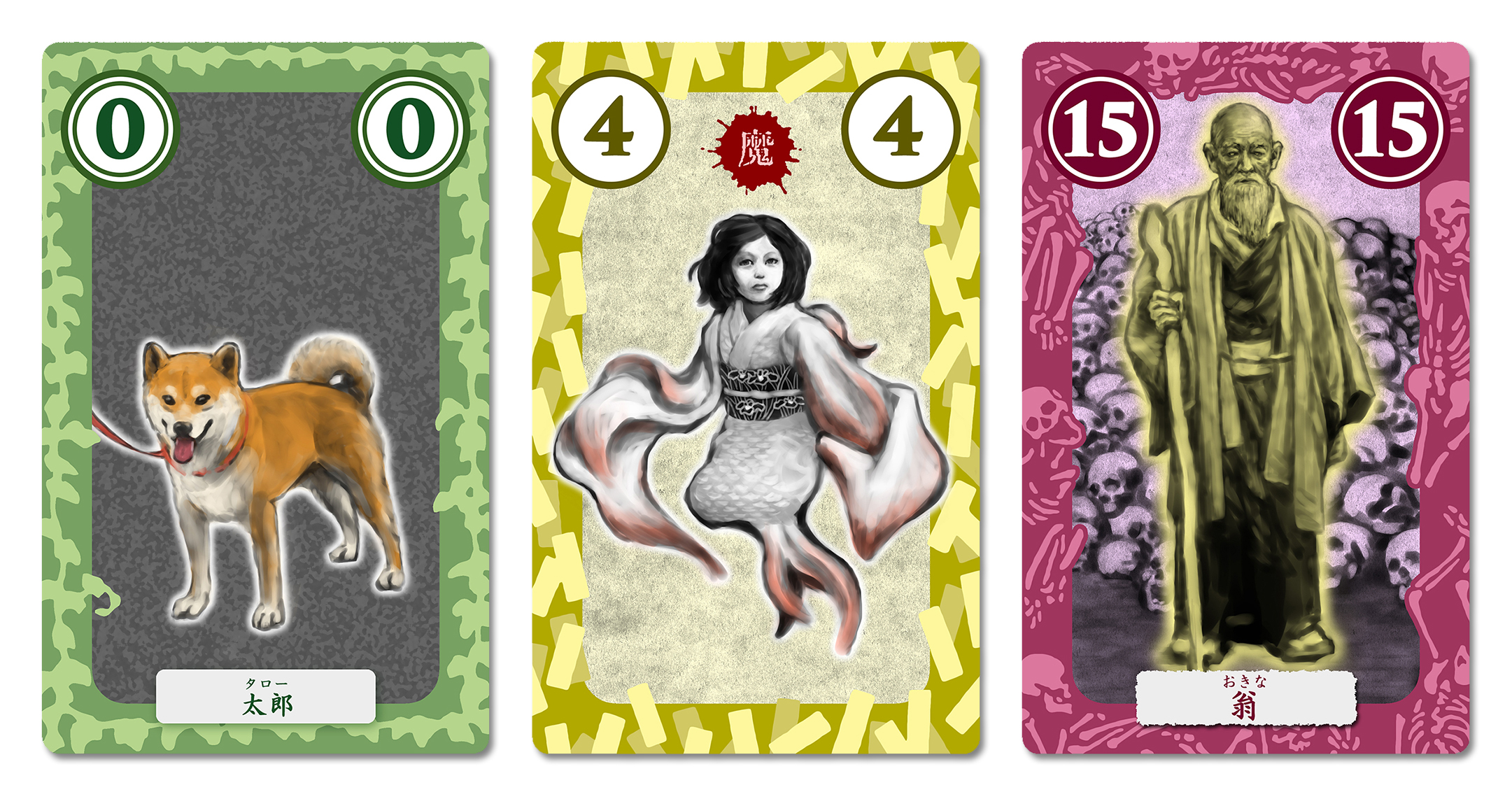 子どもやお化けが描かれた得点札を集めるゲームです。