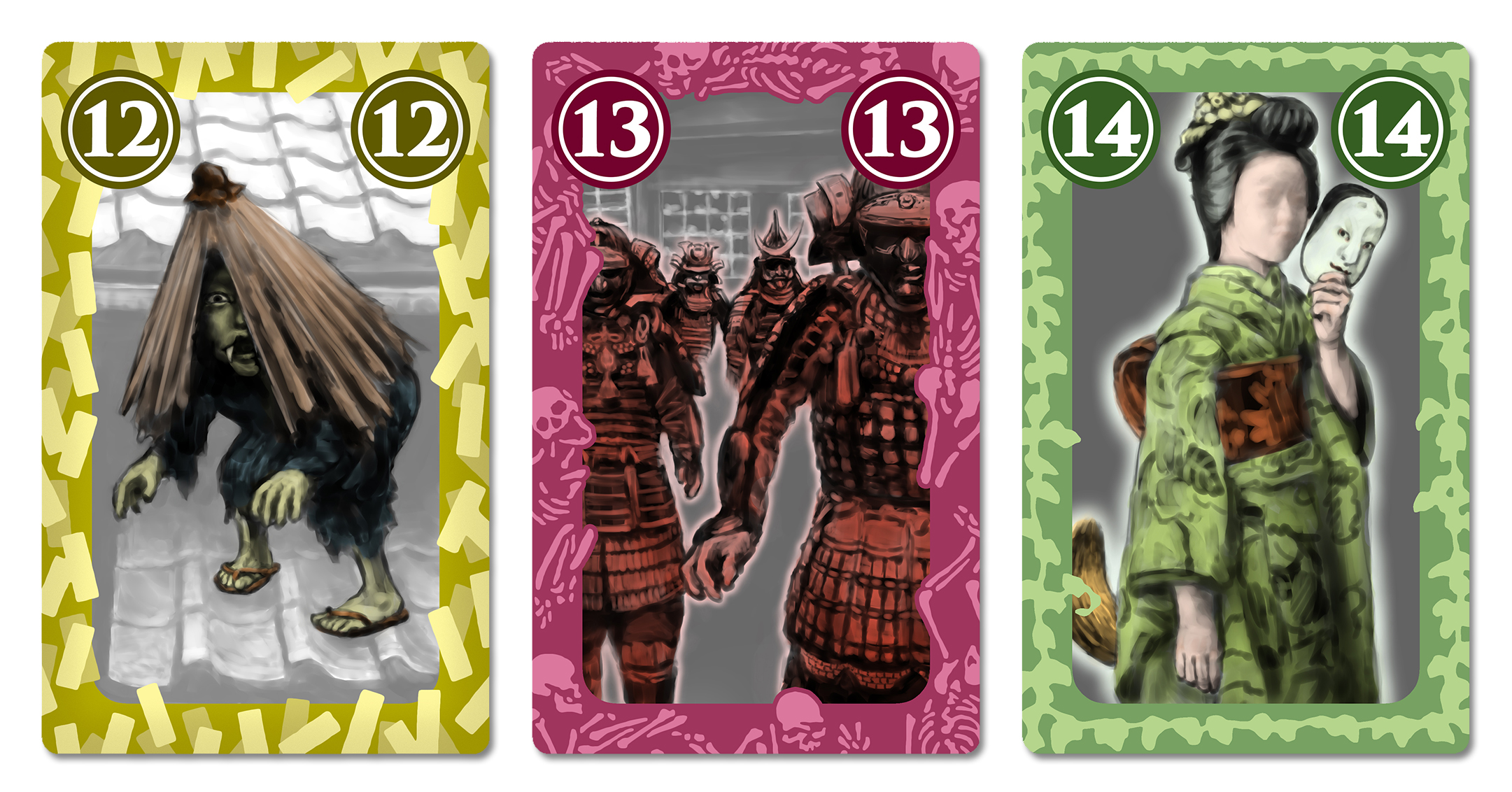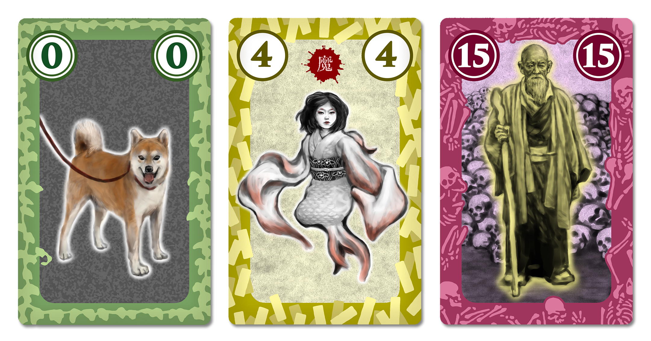 子どもやお化けが描かれた得点札を集めるゲームです。